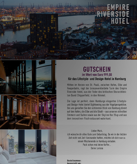 Put a smile on your loved ones face or make friends and business partners happy with our gift voucher. This present is suitable for nearly every taste and occasion. The voucher guarantees a wonderful stay in a great location and is redeemable in the entire Empire Riverside Hotel. Whether the voucher is used for an overnight stay with harbour view, a cocktail at the Skyline Bar 20up or a culinary journey with our Kiezmenü at the restaurant waterkant – it is a great gift idea for everyone! The voucher templates of the Skyline Bar 20up and the restaurant waterkant only contain information about the bar or the restaurant.