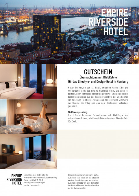 Schenken Sie Ihren Liebsten den schönsten Blick auf den Hamburger Hafen und die Stadt, ob Geburtstag, Jahrestag oder als Dankeschön. Mit diesem Gutschein kann das volle Hamburg-Erlebnis aus den stilvollen Zimmern, der Skyline Bar 20up und aus dem Fischrestaurant waterkant genossen werden. Eine Übernachtung in einem Zimmer mit RIVERstyle und zubuchbaren Extras.
